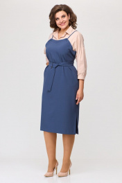 Дизайнерское платье. Ультрамодное платье состоит из комбинации 2ух тканей: хлопковой рубашечной и костюмно-плательной. Платье имитирует комплект блузы и сарафана. Силуэт прямой. Платье без застёжки. Воротник рубашечный. Линия рукава спущена, в области плеча небольшая сборка, внизу рукава манжета на 1 петлю и пуговицу. Длина рукава 26плечевой+38 см. По переду платья выполнена имитация сарафана. Бретельки тонкие, съёмные крепятся оригинальным декоративным узелком. На спинке платья так же выполнена имитация сарафана аналогично. В платье карманы в боковых швах. Внизу платья по боковым швам небольшие разрезы, длина 21 см. Пояс съёмный из основной ткани платья в комплекте. Длина платья по спинке 115 см.