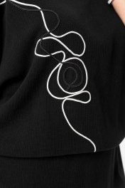 Платье выполнено из мягкого трикотажного полотна с бархатистой поверхностью. Горловина овальная, обработана бейкой, хорошо растягивается. Покрой изделия цельнокроеный. Силуэт лифа платья свободный. К низу платье прямое, слегка заужено. По линии талии вставлена резиночка. На детали переда выполнена декоративная вышивка тонким шёлковым шнуром. Спинка платья без особенностей. Платье без застёжки, без подкладки