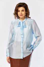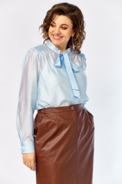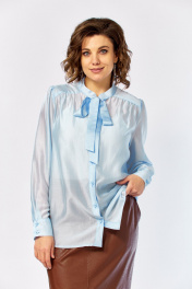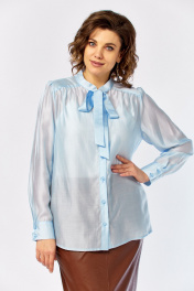 Женская блуза прямого силуэта, выполнена из блузочной ткани. По переду мягкая сборка, выходящая из отрезных кокеток.По спинке небольшая сборка по центру, выходящая из кокетки. Рукава втачные, со сборкой по окату, со складкой по низу рукава и отрезными манжетами на 2 петли и пуговицы. Воротник стойка с завязывающимся бантом. Застежка по переду на петли и пуговицы. Длина блузы: 67см. Длина рукава:63см.