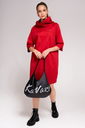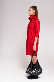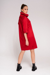 Платье женское свободного кроя, прямого силуэта. Рукава реглан, проходящие в середину горловины. По переду платья с левой стороны имеется имитация кармана с листочкой. По спинке находятся застежка-планка на кнопки-пуговицы. Платье с воротником стойкой с застежкой на кнопку. Длина изделия - 93 см. Длина рукава - 48 см