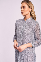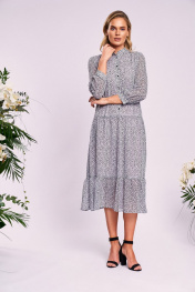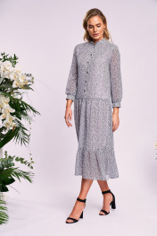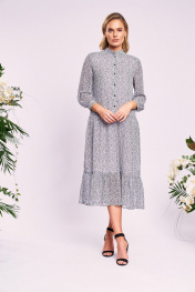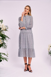 Платье свободного кроя из шифона длина макси. Верхняя часть переда с планкой которая застегивается на пуговицы. Платье с двумя воланами на сборке. Воротник стойка. Рукав втачной со сборкой по низу с притачной манжетой. Платье на подкладке. Длина платья -123 см. Длина рукава - 51 см.