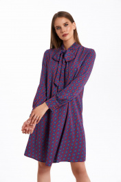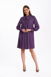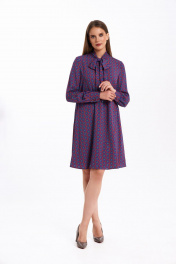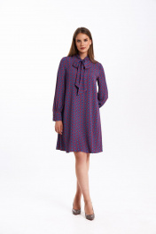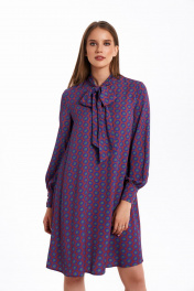 Платье свободного силуэта, расширенное к низу, выполнено из вискозного полотна с воротником-стойкой переходящим в бант. Рукава в изделии втачные одношовные со сборкой по низу с отрезной манжетой на 3 петли и пуговицы. Платье на подкладке. Ремень не входит в комплект. Длина изделия - 95 см Длина рукава - 61 см