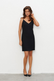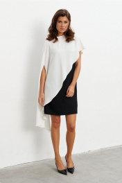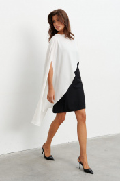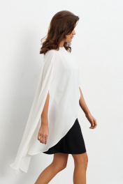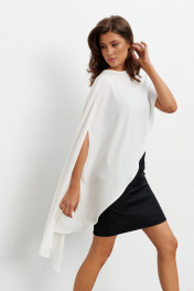 Комплект состоящий из платья-комбинации длиной мини и асимметричной блузки. Платье выполнено из струящейся ткани. Высота бретелей регулируется, в боковом шве потайная молния. Блузка из струящейся ткани по форме напоминает кейп. Левая сторона короче и спадает с плеча, а правая - длинная с прорезью для руки. Сзади по горловине застёжка на пуговицу. Длина по середине спинки - 73 см Длина блузы- 115 см