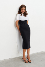 Комплект состоящий из плотного платья-футляра и струящейся, контрастной накидки. Платье прилегающего силуэта длиной миди. Вырез горловины - каре. Сзади шлица и застёжка на потайную молнию. Накидка создаёт эффект пелерины с застёжкой на пуговицу сзади. Длина по середине спинки - 105 см Длина накидки - 140 см