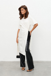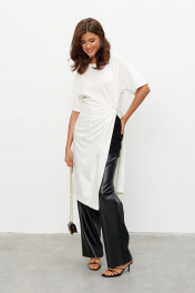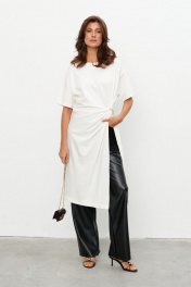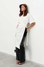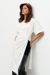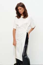 Комплект из трикотажного полотна состоящий из платья-туники и шорт. Платье со спущенным плечом и рукавом до локтя, горловина отделана эластичной бейкой. Сбоку, чуть ниже талии, конструктивный элемент в виде узла, переходящего в высокий разрез. Через узел протянуто декоративное золотое кольцо. Шорты плотно прилегающие на резинке по поясу. Длина по середине спинки 44-48р -112,5 см 50-54р -113 см Длина рукава 44-54р -20 см