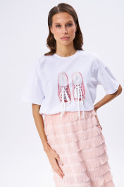 Комплект из двух предметов: футболка и юбка. Объёмная футболка со спущенной линией плеча. По переду принт «кеды» со шнурками, завязанными на бантик. Юбка прямого силуэта длины макси на резинке по талии с разрезами по бокам.