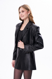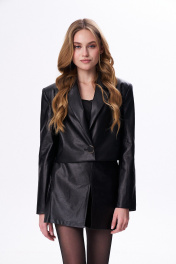 Укороченный жакет прямого силуэта длиной чуть ниже линии талии. Воротник и лацкан классические. Линия плеча слегка расширена. Застежка на одну пуговицу. На рукавах шлицы с пуговицами. шорты с эффектом юбки по переду с карманами по бокам и застёжкой на потайную молнию сзади