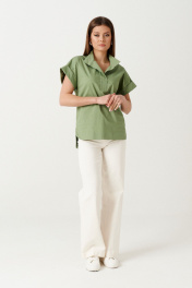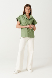 Блузка свободного кроя выполнена из натурального полотна. Характеристики: свободный крой, воротник- стойка, рукав короткий цельнокроеный с отложной манжетой.