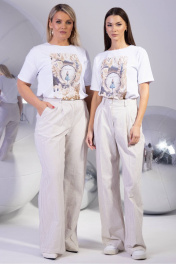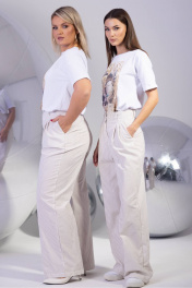Брюки палаццо свободного кроя с вертикальной полоской — комфорт и элегантность для вашего гардероба Идеальные для создания утонченных образов, брюки палаццо свободного силуэта сочетают в себе легкость и практичность. Модель изготовлена из высококачественной хлопковой ткани с добавлением эластана, что обеспечивает мягкость, воздухопроницаемость и идеальную посадку по фигуре. Благодаря эластичному волокну брюки не сковывают движения, сохраняя форму даже при активной носке. Вертикальная полоска в мелкий рисунок визуально вытягивает силуэт, добавляя образу стройности и динамики. Эта деталь делает модель универсальной: брюки легко комбинировать с однотонными блузами, объемными свитерами или приталенными жакетами. Особое внимание уделено комфорту для обладательниц 48 размера и больше: в спинку пояса встроена эластичная резинка, которая мягко поддерживает, не создавая давления. Такая конструкция обеспечивает идеальную посадку без заломов, подчеркивая талию и маскируя лишние объемы. Параметры моделей на фото: 1. Рост 175, ОБ 115, ОТ 78, ОГ 96. Изделие на фото 52 XXL 2. Рост 175, ОБ 89, ОТ 60, ОГ 80. Изделие на фото 42 XS