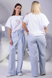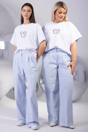 Брюки палаццо свободного кроя с вертикальной полоской — комфорт и элегантность для вашего гардероба Идеальные для создания утонченных образов, брюки палаццо свободного силуэта сочетают в себе легкость и практичность. Модель изготовлена из высококачественной хлопковой ткани с добавлением эластана, что обеспечивает мягкость, воздухопроницаемость и идеальную посадку по фигуре. Благодаря эластичному волокну брюки не сковывают движения, сохраняя форму даже при активной носке. Вертикальная полоска в мелкий рисунок визуально вытягивает силуэт, добавляя образу стройности и динамики. Эта деталь делает модель универсальной: брюки легко комбинировать с однотонными блузами, объемными свитерами или приталенными жакетами. Особое внимание уделено комфорту для обладательниц 48 размера и больше: в спинку пояса встроена эластичная резинка, которая мягко поддерживает, не создавая давления. Такая конструкция обеспечивает идеальную посадку без заломов, подчеркивая талию и маскируя лишние объемы. Параметры моделей на фото: 1. Рост 175, ОБ 115, ОТ 78, ОГ 96. Изделие на фото 52 XXL 2. Рост 175, ОБ 89, ОТ 60, ОГ 80. Изделие на фото 42 XS