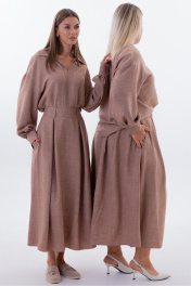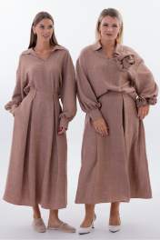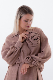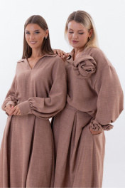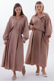 "Костюм со съемным декором Kivvi Wear — Элегантность в Движении Kivvi Wear представляет идеальный дуэт, где современный шик встречается с непревзойденным комфортом. Блуза свободного кроя и удлиненная юбка-трапеция — это воплощение утонченной эстетики и свободы самовыражения. Каждая деталь этого ансамбля продумана для создания гармоничного и целостного образа. Блуза прямого силуэта с отложным воротником и глубоким вырезом служит идеальной основой. Широкие рукава со сборкой на манжетах мягко ниспадают, добавляя пластичности и легкости каждому движению. Уникальность модели подчеркивают съемные декоративные цветы из основной ткани: разместите их на груди или рукавах, чтобы придать образу романтичность, или уберите для создания лаконичного строгого образа. Юбка-трапеция с аккуратными встречными складками по переду и спинке визуально вытягивает силуэт, подчеркивая его изящество и легкость. Скрытые складки создают мягкий объем, который красиво колышется при ходьбе, даря ощущение невесомости и утонченности. Обе вещи гарантируют комфорт в течение всего дня. Этот костюм — готовое решение для тех, кто ценит универсальность и стиль: носите его как цельный ансамбль для особых случаев или комбинируйте вещи отдельно с другими элементами гардероба."