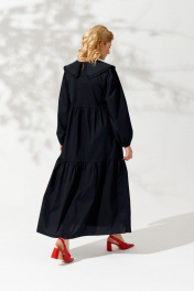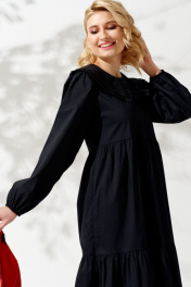 Длинное платье с воротником. Длина платья до щиколотки. Воротник аккуратный, со сборкой. По переду расположено два яруса воланов со сборкой. Рукав пышный, длинный, на резинке по низу. По спинке так же расположено два яруса воланов со сборкой. В верхней части спинки расположен средний шов, заканчивающийся вырезом, на котором расположена застежка на петлю - пуговицу. В боковых швах платья расположены карманы. Преимущества кроя этого платья в том, что такой силуэт скроет все недостатки вашей фигуры, но при этом вы останетесь женственной и хрупкой. Его можно носить как с поясом, так и без. Платье с воротником прекрасно подходит молодым девушкам, оно смотрится весьма кокетливо и романтично. Женщинам постарше такие платья тоже пригодятся: с их помощью можно легко убавить от своего возраста в глазах окружающих несколько лет и почувствовать себя моложе. Такое платье прекрасно подойдет для свидания, в нем можно отправиться на прогулку или в кафе. Воротник - уместная деталь и в модном офисном гардеробе. Ремень в комплект платья не входит.