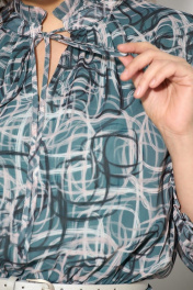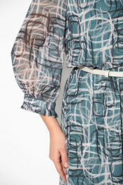 Нарядное женское платье из шифоновой ткани с принтом, на подкладке, длиной ниже колена, отрезное по линии талии, на резинке, юбка слегка расширена к низу. Горловина круглая с неглубокими складками, вырезом «капелька» по центру переда и стойкой. В стойку вставлена невысокая рюша и плоский шнур из основной ткани, завязывающийся на бант. Рукав втачной ¾, на манжете, с рюшей по низу. В качестве дополнительного декора использован ремень.