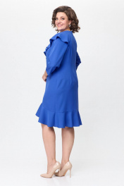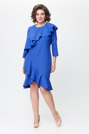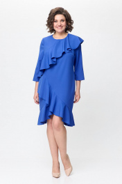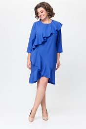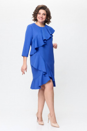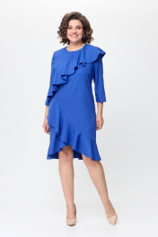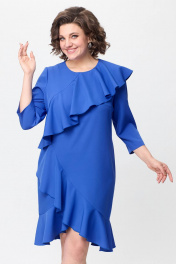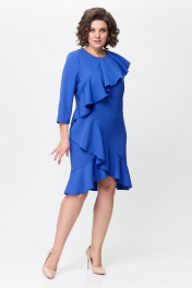 Нарядное женское платье из стрейчевой ткани с добавлением вискозы. Силуэт полуприлегающий. Вырез горловины круглый с застежкой на потайную молнию по спинке. Рукав ¾. Нарядность платью придают широкие ассиметричные воланы по переду платья и фигурный низ.