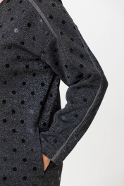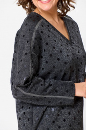 Нардное женское платье из трикотажного полотна с добавлением хлопка и метонити. Силуэт прямой с заужением к низу, длина чуть ниже колена, вырез горловины У-образный с планкой, линия плеча слегка опущена, от горловины по всей длине рукава вставлены две узких полоски из блестящей отделочной ткани.