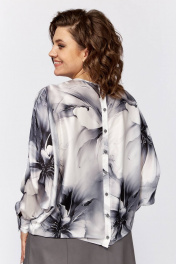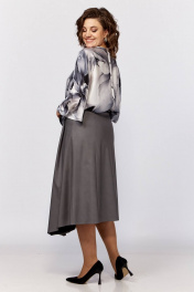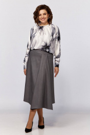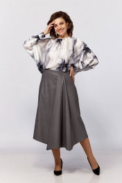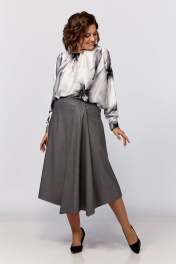 Нарядный женский комплект, состоящий из блузки и юбки. Блузка из непрозрачной ткани с добавлением вискозы и шелка. Вырез горловины круглый с небольшой сборкой по переду. По центру спинки планка с застежкой на мелкие пуговицы. Рукав цельнокроеный со сборкой понизу и манжетой с застежкой на пуговицы. Юбка удлиненная, из экокожи, на подкладке, с отрезным поясом-кокеткой и застежкой на потайную молнию в боковом шве. Нарядность модели придает необычное конструктивное решение юбки. Юбка из экокожи на подкладке, с поясом-кокеткой и застежкой на потайную молнию в боковом шве. По переду юбки вставка с бантовой складкой и у-образной линией низа, что позволяет сделать силуэт расширенным к низу.