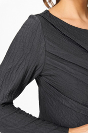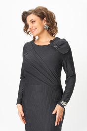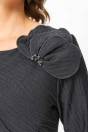 Нарядное женское платье из трикотажного полотна с добавлением вискозы, с оригинальной выпуклой фактурой с рисунком в тон. Силуэт полуприлегающий, по переду отрезное по линии талии, по лифу наклонные бантовые складки, вырез горловины круглый, рукав длинный, по спинке в среднем шве разрез. Съемный цветок украшен декоративными пуговицами-стразами.