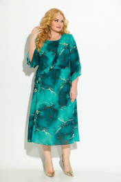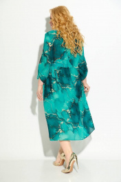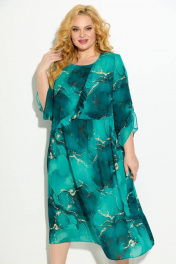 Нарядное женское платье из принтованной шифоновой ткани.По переду платья два подреза.Справа фигурный подрез,в который вставлена декоративная деталь в виде рюши.Слева по переду и спинке горизонтальный подрез со складкой и сборкой.Сборка позволяет сделать силуэт слегка расширенным к низу.Вырез горловины круглый.Рукав 3/4 с патой на пууговице.Длина платья ниже колена.Нижнее платье выполнено из трикотажной подкладки на регулируемых брителях.