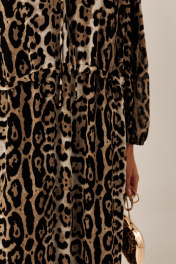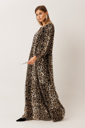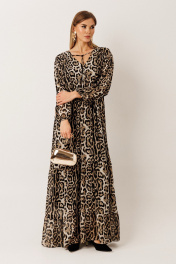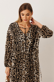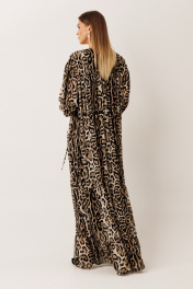 Платье из шифона: – свободный силуэт – длина макси – леопардовый анималистичный принт – по переду и спинке в районе талии — кулиса для регулировки объёма – горловина с V-образным вырезом и декоративными завязками – рукав длинный, на резинке
