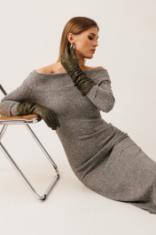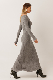 Платье: – выполнено из плотного трикотажного полотна – облегающий силуэт – открытые плечи – по спинке внизу — высокий разрез