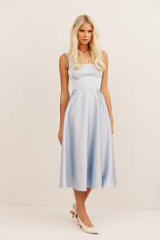 Платье: - приталенный силуэт вверху - атласная ткань - рельефы по переду - расширенный силуэт юбки «солнце» - длина миди - округлый вырез по спинке - потайная молния в среднем шве - подкладка из поливискозы