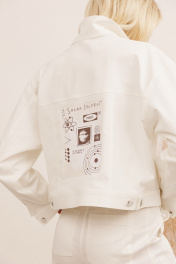 Жакет: - свободный силуэт - джинсовая хлопковая ткань - спущенная линия плеча - кокетка и клапаны по переду - рельефные швы - застёжка на кнопки‑пуговицы - длинные рукава с манжетами - кокетка и рельефные швы по спинке - дизайнерская графическая печать по спинке