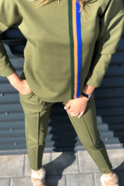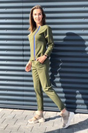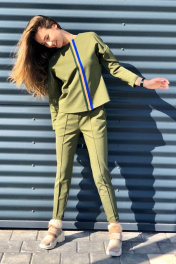 Джемпер полуприлегающего силуэта. Плечо спущено. Рукава втачные, слегка заужены к низу. Брюки свободного силуэта, зауженные к низу. Брюки на притачном поясе с двумя складками от пояса, задняя часть пояса на резинке и с боковыми наклонными карманами.