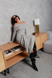 Платье облегающего кроя с открытыми плечами. Подчеркивает женственные изгибы. Длина платья по спинке - 137 см. Длина рукава - 70см.