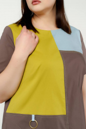 Трапециевидного силуэта с коротким втачным рукавом и нагрудными вытачками. Перед с подрезами, средним швом и кольцом. В боковых швах- карманы и разрезы. Выполнено в комбинации однотонных хлопков.