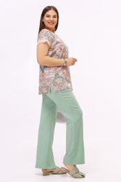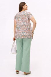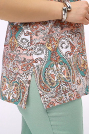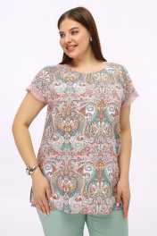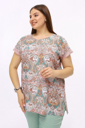 Удлиненная женская блузка свободного силуэта с рукавом покроя реглан и нагрудными вытачками. Низ рукава дополнен кружевом. В боковых швах - разрезы. Ткань - штапель с рисунком. Рост 170.