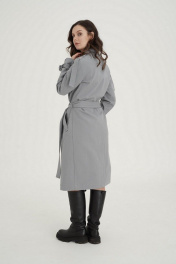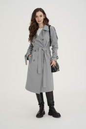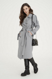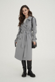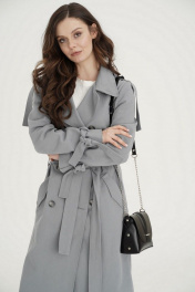 Демисезонный серый плащ на подкладке с капюшоном и поясом LadisLine 1419 серо-голубой