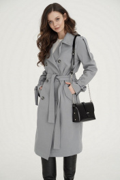 Плащ женский, прямого силуэта, на подкладке. Застежка двубортная на три петли-пуговицы. По полочке прорезные карманы с клапанами. Рукав втачной, двухшовный. По низу рукава пата с завязкой, по плечу пата-погон, свободно спадающая на рукав. Спинка со средним швом и шлицей по низу. Воротник пиджачный с отрезной стойкой. В комплекте пояс из основной ткани