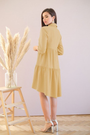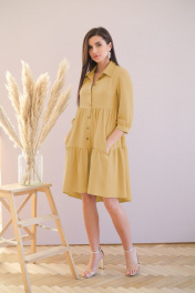 Платье женское свободного силуэта. По полочке два подреза, выше линии талии и на уровне бедер. По подрезам выполнены сборки. Застежка центральная на петли и пуговицы до второго подреза. По полочке от проймы рельефы, в которых расположены функциональные карманы на уровне бедер. Рукав втачной, одношовный, снизу манжет, застегивающийся на пуговицу. Воротник рубашечного типа.