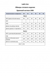 Женский брючный костюм двойка, состоящий из жакета и брюк, выполнен из ткани лен-вишер. Жакет прямого силуэта с ассиметричной застежкой. Жакет однобортный, с застежкой на петли и пуговицы, воротник пиджачный с округлыми концами. Рукав реглан, короткий. На левой полочке имитация кармана, оформленного листочкой. Низ жакета фигурный. Спинка прямая, без среднего шва. Жакет без подкладки. Брюки прямые, в боковых швах функциональные карманы. Пояс притачной с резинкой. Снизу брючины могут собираться на шнурок, формируя силуэт ""бананы"". Фурнитура может отличаться от представленной на фотографии.