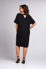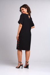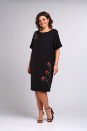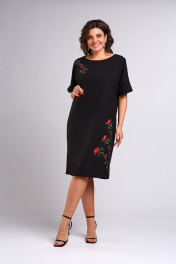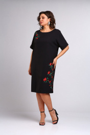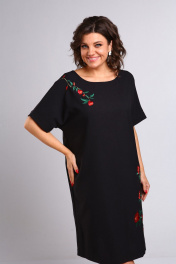 Летнее женское платье прямого силуэта из ткани лен-вишер, длиной миди. Полочка платья прямая, без вытачек. Горловина округлая, слегка расширена. Рукав короткий, реглан. Полочка платья украшена вышивкой. Спинка однотонная, со средним швом. В верху среднего шва треугольный вырез с перемычкой. Снизу среднего шва шлица. Платье без подкладки.
