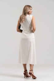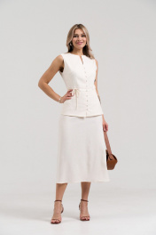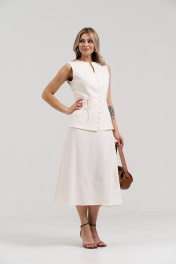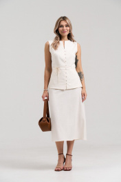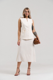 Летний юбочный комплект из ткани лен -вишер, цвета натурального льна. Комплект состоит из жилета и юбки. Жилет приталенного силуэта, отрезной по линии талии, по линии отреза вставлена широкая планка. Застёжка центральная на навесные петли и пуговицы. Вырез горловины фигурный. Жилет без рукавов, проймы обработаны косой бейкой. Полочка до линии талии на подкладке из основной ткани. Юбка длиной миди, за колено, расширенная к низу. Верх на обтачке. В боковом шве вставлена потайная молния. В комплекте пояс - шнурок из основной ткани.
