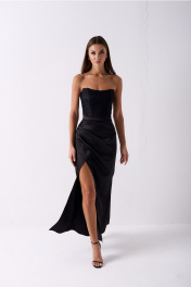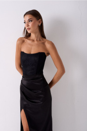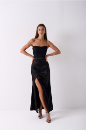 Комплект 2х предметный, состоит из корсета и юбки. Корсет 2х слойный состоит из верхнего слоя кружева и нижнего корсетного атласа. Корсет на подкладке из шёлка. По спинке воздушные навесные петли для шнуровки и шнур, с помощью которого можно плотно затянуть и завязать корсет и тем самым подчерунуть Женственность и красоту. Юбка длина макси из атласа, средней плотности . По переду по левой детали заложены глубокие складки, направленные вверх. По правой ноге деталь заходит под левую в полузанос, тем самым образовывая глубокую отлетную шлицу (разрез). По задней части юбки застрочены талиевые вытачки, по центру среднего шва притачана потайная тесьма молния. Юбка на поясе. Пояс с застёжкой с зади на прорезную петлю и пуговицу. Изделие можно носить и в комплекте и с другими изделиями, создавая различные стильные образы. Юбка длиной по боковому шву 90см.