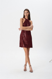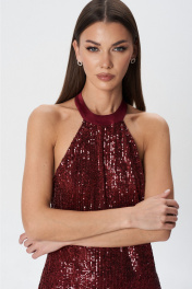 Платье с открытой спиной пошито из нарядных тканей, пайеток, атласа, трикотажного полотна с люрексом. Модель 1583 изготовлено из ткани пайетки и на подкладке из мягкой, приятной к телу сеточки. Силуэт платья А-образный. По переду по лифу две нагрудные вытачки. По горловине притачана стойка прилегающая, которая сзади застёгивается на две петли и пуговицы.