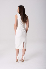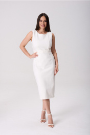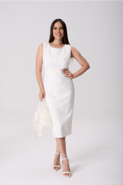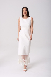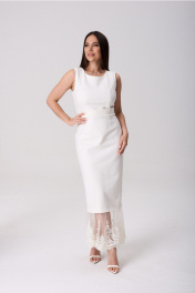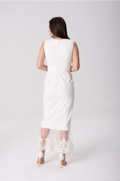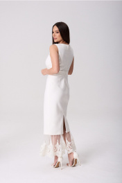 Платье полуприлегающего силуэта выполнено из плотной высококачественной вискозной ткани джерси с лайкрой. По линии талии платье отрезное и с притачной планкой. Лиф состоит из центральной части и рельефов выходящих из пройм. Вырез горловины лодочка. Спинка состоит из центральной части и рельефов выходящих из пройм. Юбка с застроченными талиевыми вытачками по переду и спинке. По центру спинки застёжка на потайную тесьму-молнию. Платье без рукавов. Длина платья Миди. К низу платье слегка заужено. Так же по нижнему краю платья с помощью кнопок на тесьме прикреплён волан из кружева. Для удобства шага сзади выполнен разрез, в котором пришита потайная тесьма молния, которую при желании можно растегнуть до нужной глубины разреза.. Платье может быть одето как для торжественных и особенных случаев, так и для повседневной носки. Кружево можно отстегнуть. Длина платья с кружевом по центру спинки до низа -108см Длина платья по центру спинки до низа без кружева-135см