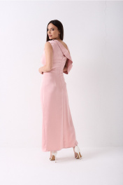 Платье Вечернее, нарядное, полуприлегающего силуэта с одним открытым плечом на брителе шириной 3см. По переду и спинке по диагонали пришита ассиметричная отложная шаль-стола, которая проходит по левому надплечью мягко спадает от уровня глубины проймы справа к локтю. По спинке застрочены талиевые вытачки. По переду заложены многочисленные диагональные складки. Нижняя часть платья с глубоким разрезом справа и закруглённой левой частью юбки Срезы застрочены двойной подгибкой. По центру спинки платье застёгивается на потайную тесьму молнию. Длина платья при росте 164 до щиколотки или от плеча до низа 149см