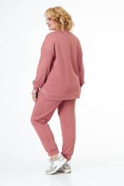 Комплект спортивного стиля из мягкого трикотажного полотна «футер 3-х нитка», состоящий из свитшота и брюк.Свитшот прямого силуэта со спущенной линией плеча. По переду и левому рукаву декоративный принт, рукава длинные с притачными манжетами из трикотажного полотна «рибана» в цвет основной ткани. Низ имеет фигурную линию, спинка длиннее полочки. Брюки на поясе с резинкой и наклонными карманами по переду, по низу брюк притачные манжеты из основной ткани. Длина свитшота по переду около 56/58 см, по спинке около 73/75 см, длина рукава+ плечо около 73 см; длина брюк по боковому шву с поясом около 102/104 см, по шаговому шву 72/74см