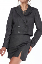 Костюм, состоящий из стильного укороченного жакета и юбки, в котором гармонично сочетаются элегантность и практичность. Жакет двубортный прямого силуэта из костюмной ткани. Воротник пиджачного типа с двубортной застёжкой на петли и пуговицы. Перед с рельефами. Спинка со средним швом и рельефами. Рукав втачной, дувухшовный. Жакет на подкладке. Длина изделия по спинке 45 см в зависимости от размера, длина рукава 62 см. Мини-юбка карандаш с разрезом по ноге. Юбка на подкладке, застегивается сзади на потайную молнию. Наш элегантный костюм создаст необходимый для офиса деловой стиль. Жакет и юбку можно приобрести отдельно. Модели 2432 и 2421 соответственно.