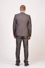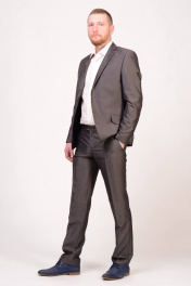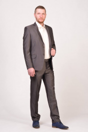 Классический мужской костюм средней зауженности. Модель пиджака на две пуговицы, с одной шлицей. Брюки средней посадки, без защипов. Костюмная ткань не мнется и имеет отлив.