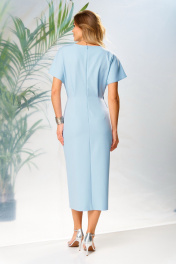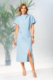 Платье женское из приятной плательной ткани, прилегающего силуэта, длиной до середины икр, со спущенной линией плеча, с застежкой на потайную тесьму-молнию в среднем шве спинки. Деталь переда платья с талиевыми вытачками, с ассиметричной деталью на запах, которая оформлена декоративной пряжкой, на левом плечевом шве обработаны 3 складки. Деталь спинки платья со средним швом, с 2-мя талиевыми вытачками-складками. Вырез горловины платья формы «лодочка», обработан обтачкой. Декор может отличаться от представленного на фотографии. Платье: длина плеча – 28см, длина спинки – 118см.
