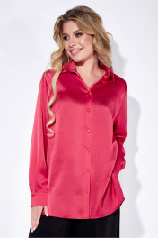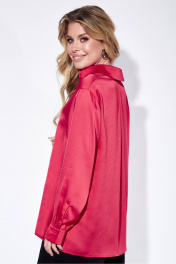 Блузка женская, прямого силуэта, длиной ниже линии бедер, со спущенной линией плеча, с втачными рукавами, с разрезами в боковых швах, с центральной сквозной застежкой на 7 петель и 7 пуговиц и 1 петлю и пуговицу на стойке воротника. Детали переда блузки с цельнокроеными планками, с нагрудными вытачками. На детали спинки блузки по горловине вертикально обработана складка. Рукава рубашечные втачные одношовные, с притачными манжетами, застегивающимися на 1 петлю и 1 пуговицу. По швам притачивания манжет закладываются по 2 складки. Разрезы рукавов обработаны окантовкой. Воротник сорочечный с отрезной стойкой. Длина спинки – 71см. Длина рукава (с манжетой) - 59см, ширина рукава – 20см.