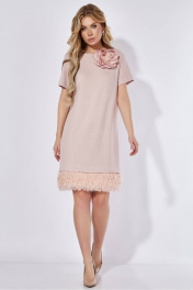 Платье женское, полуприлегающего силуэта, с втачными рукавами, длиной до коленей. Деталь переда платья с нагрудными вытачками, вверху расположен съемный декоративный «цветок». На детали спинки вверху настрочена декоративная тесьма. Рукава втачные одношовные, короткие. Вырез горловины платья округлой формы, обработан обтачкой. По низу платья съемный элемент из отделочной ткани, который застегивается на 13 петель и 13 пуговиц. Длина спинки – 92см. Длина рукава - 19см, ширина рукава – 18,5см.