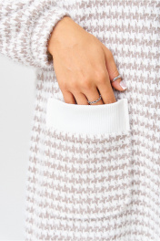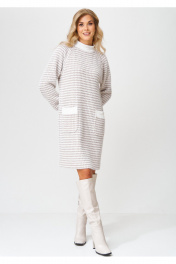 Платье женское, полуприлегающего силуэта, с втачными рукавами-реглан, длиной до линии колена, с втачным воротником-стойкой. Деталь переда платья с 2-мя накладными карманами. Рукава-реглан одношовные, с притачными манжетами. Вырез горловины платья округлой формы, с втачным воротником-стойкой из отделочной ткани. Декор может отличаться от представленного на фотографии. Платье: длина рукава (с манжетой) - 69см, ширина рукава – 21см, длина спинки – 95см.
