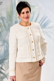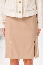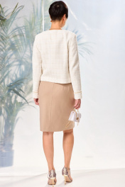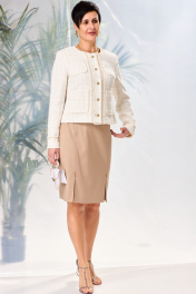 Жакет женский, полуприлегающего силуэта,из буклированной трикотажной ткани молочного цвета на подкладке, длиной до линии бедер, с втачными рукавами, с центральной сквозной застежкой на 5 петель и 5 пуговиц. Детали переда жакета с нагрудными вытачками, с 2-мя накладными карманами с каждой стороны, по центру вертикально расположена декоративная тесьма. Деталь спинки жакета с плечевыми вытачками. Рукава втачные двухшовные, с передним и локтевым швами, по низу рукавов горизонтально расположена декоративная тесьма. Вырез горловины округлой формы «под горло». Жакет с притачной понизу подкладкой. Юбка женская на талии из костюмно-плательной ткани бежевого цвета, плотно облегающая вверху и прямая к низу, на подкладке, длиной до коленей, с застежкой на потайную тесьму-молнию в среднем шве заднего полотнища. Переднее полотнище юбки с двумя рельефными швами, которые заканчиваются разрезами, вверху разрезов прикреплены декоративные элементы, вверху швов прикреплены «паты» с пуговицами. Заднее полотнище юбки со средним швом, на каждом полотнище обработаны по 2 вытачки. Верхний срез юбки обработан обтачкой. Декор может отличаться от представленного на фотографии. Жакет: длина рукава - 61,5см, ширина рукава – 20см, длина спинки – 53см. Юбка: длина середины спинки – 55см.