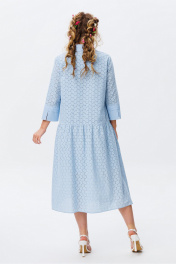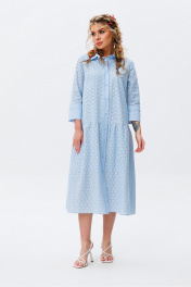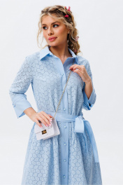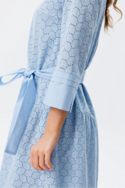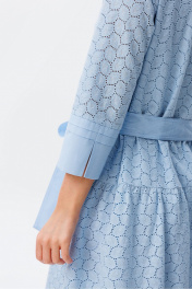 "Платье женское, повседневное, на подкладке, полуприлегающего силуэта, с втачными рукавами, длиной ниже линии колена, с втачным воротником, отрезное ниже уровня линии талии, со съемным поясом, с центральной застежкой на 9 петель и 9 пуговиц и 1 петлю и пуговицу на стойке. Деталь переда платья с притачными планками. Лиф переда с нагрудными вытачками. Деталь спинки платья с кокеткой. По шву соединения лифа с юбкой обработана сборка. Рукава втачные одношовные, длиной 3/4, с притачными широкими манжетами. Манжеты с разрезами, с 2-мя складками. Воротник сорочечный с отрезной стойкой.Длина спинки – 121см. Длина рукава – 46см, ширина рукава – 18см."