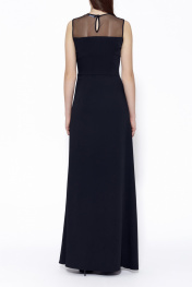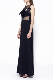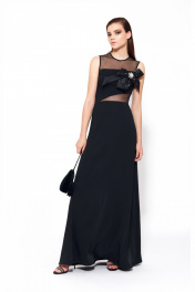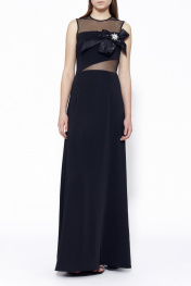 Длинное черное платье полуприлегающего силуэта с круглым вырезом горловины и декором в виде банта с бусинами.
